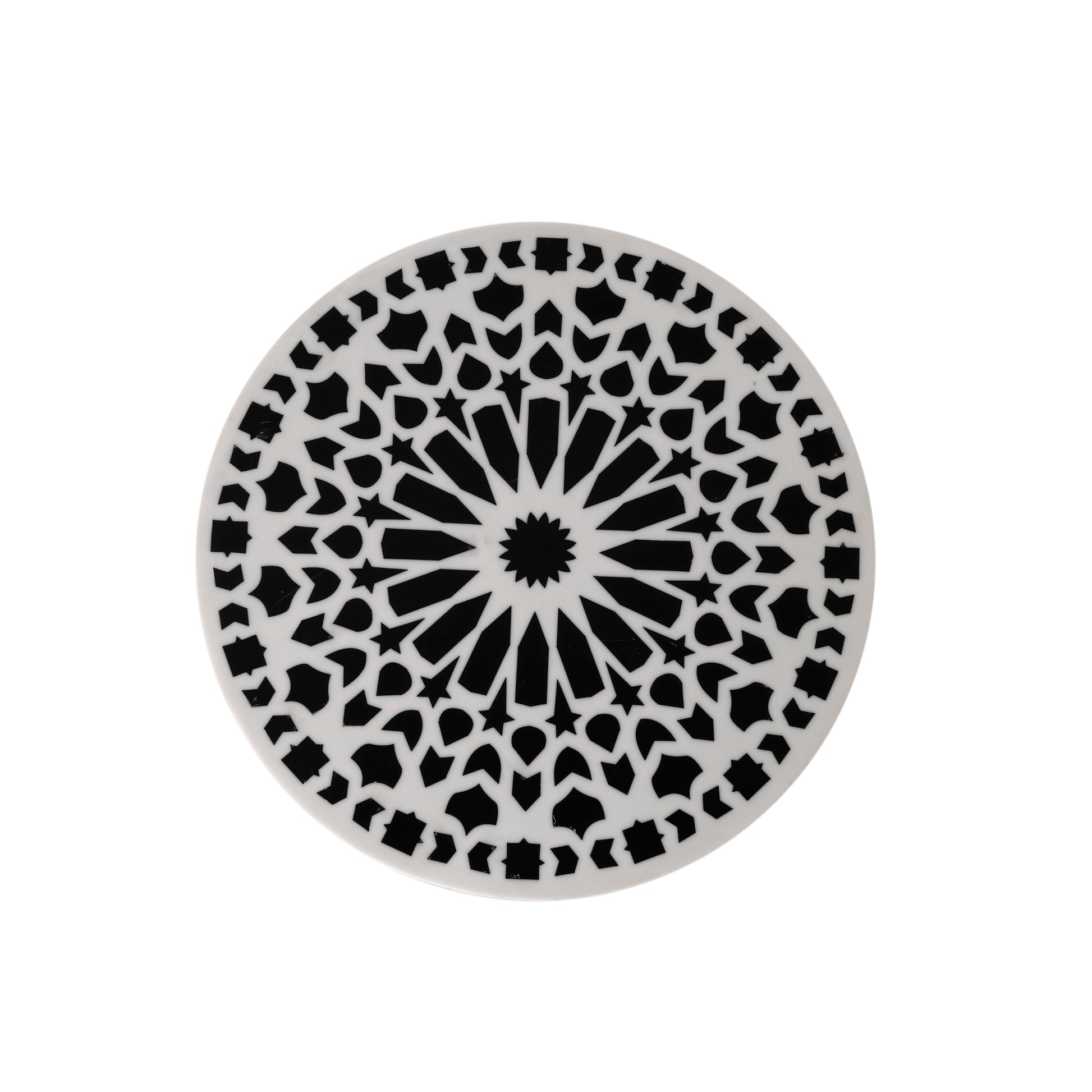 Bring artistic elegance into your living space with this Navakrti Decor Wooden Resin Top Side Table / Plant Stand. Designed with a striking black-and-white geometric resin inlay, the round tabletop sits on a solid wooden base that adds warmth and character. The sleek black metal hairpin legs provide excellent stability while maintaining a modern, minimal aesthetic.