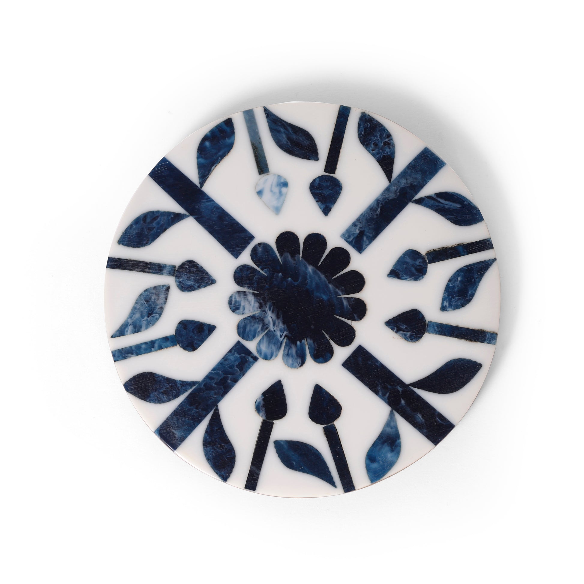 The symmetrical floral pattern, set against a clean white base with deep indigo accents, creates a striking visual contrast while maintaining refined balance. The resin surface provides added durability, making the coasters resistant to moisture and easy to clean, while protecting surfaces from drink marks and heat.