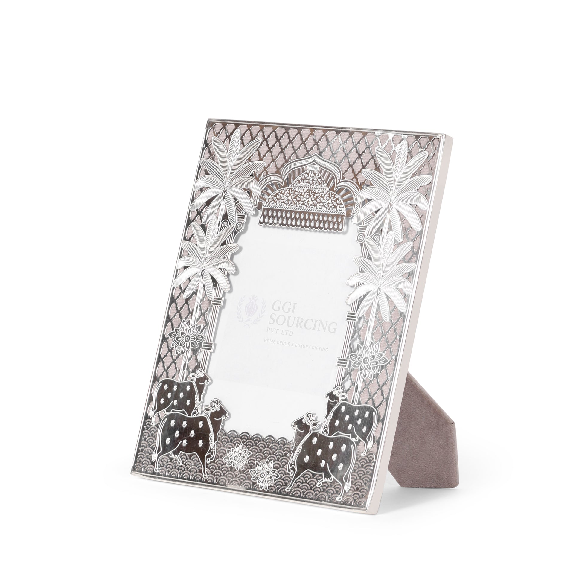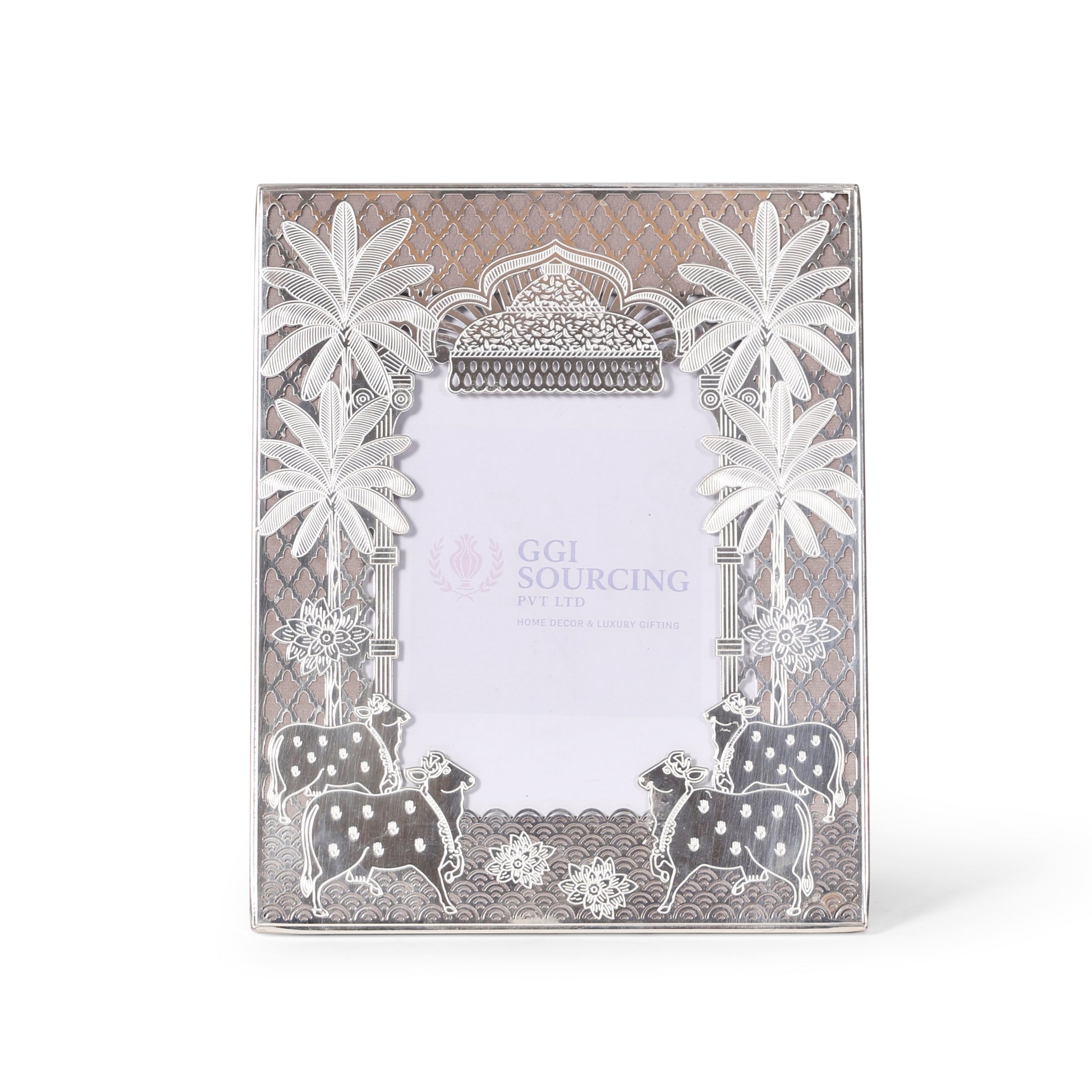 Celebrate timeless Indian artistry with the Rajwadi Heritage Silver Frame by Navakrti Decor. This exquisitely designed photo frame showcases detailed traditional motifs, including palm trees, architectural arches, floral elements, and sacred cow figures—symbolizing prosperity, culture, and heritage.