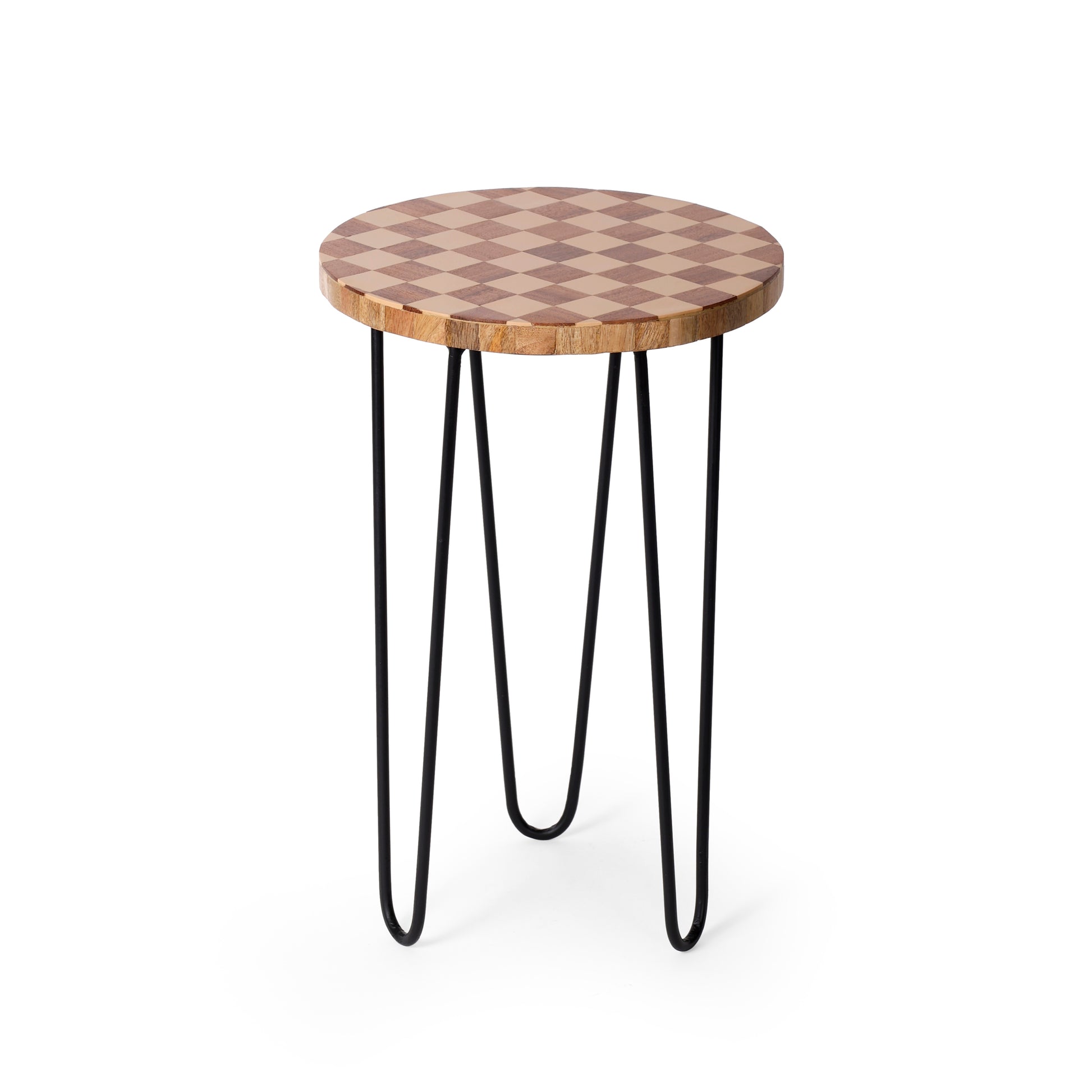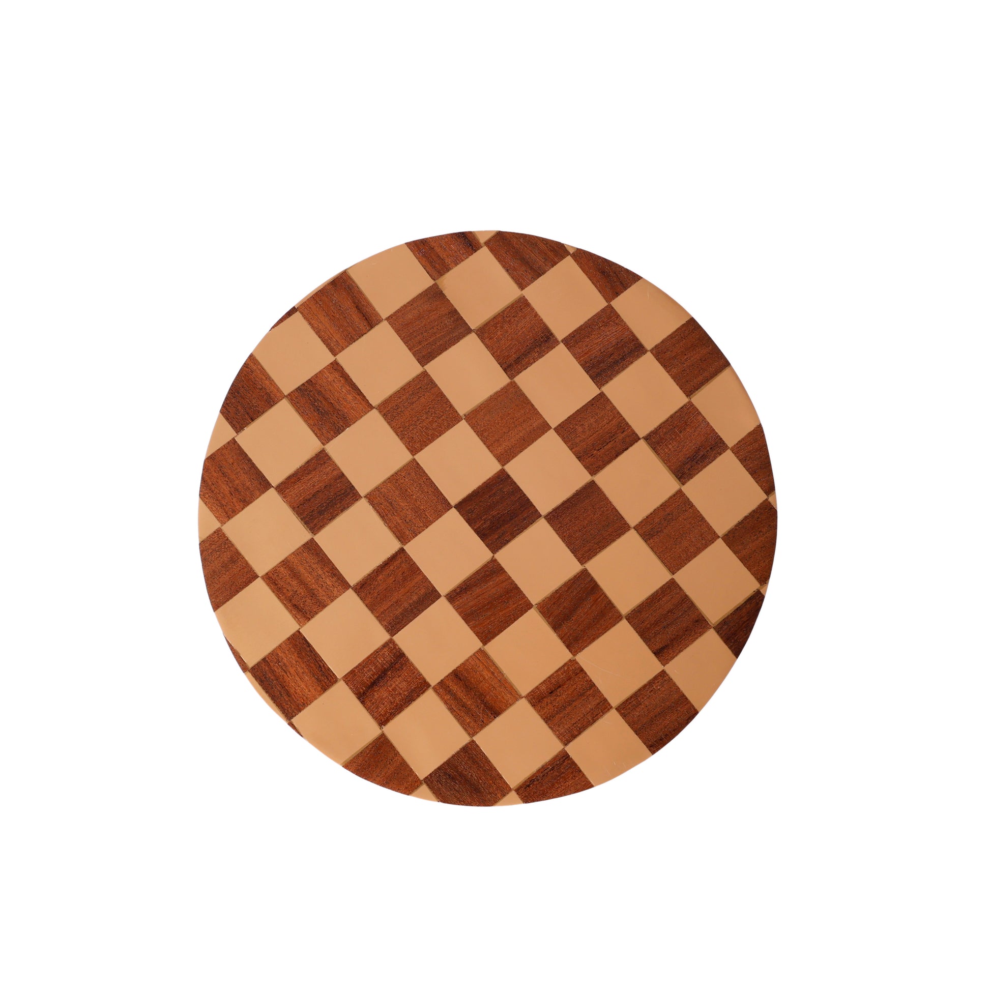 Featuring a round handcrafted wooden top with resin inlay, this table showcases a striking geometric checker pattern that adds warmth and character to any room. The smooth resin finish enhances durability while highlighting the natural wood grain, making each piece unique.